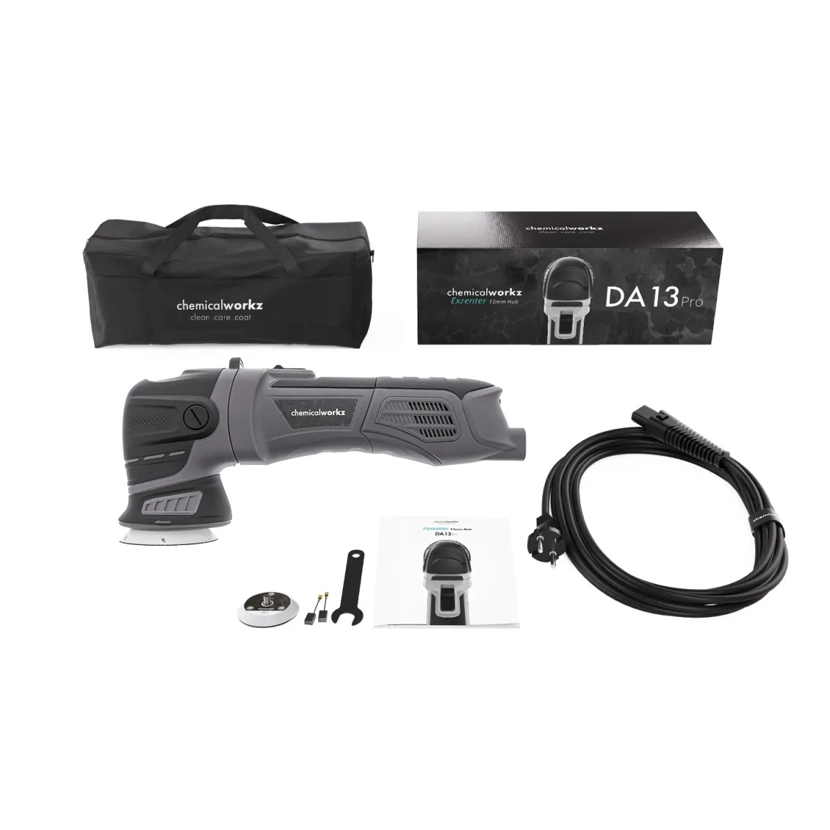 Tauche ein in die faszinierende Welt der Pro Series - Die chemicalworkz® Pro Polisher Series setzt neue Maßstäbe im Bereich der Exzenter Poliermaschinen und wurde entwickelt, um selbst höchsten Ansprüchen gerecht zu werden. Die DA9 Pro Max, DA15 Pro und DA21 Pro stellen die neuen Spitzenmodelle von chemicalworkz dar, die für professionelle Anwendungen konzipiert wurden und eine unschlagbare Performance bieten. Erlebe Fahrzeugaufbereitung auf #nextlevel mit der chemicalworkz® DA9 Pro Max - beeindruckende Leistung trifft auf maximale Präzision für die ultimative Lackaufbereitung.Mit beeindruckenden 1000 Watt Leistung, einem 9mm exzentrischen Hub und einer variablen Drehzahl von 2000-6400 U/Min ist die DA9 Pro Max das ultimative Werkzeug für Profis und Enthusiasten, die auf höchstem Niveau arbeiten. Bei der Entwicklung lag der Fokus besonders auf fortschrittlicher Technologie und robuster Konstruktion.Der progressive Gasgebeschalter ermöglicht eine fein abgestimmte Geschwindigkeitskontrolle innerhalb des Drehreglerbereichs, um die gewünschte Geschwindigkeit präzise einzustellen und bei Bedarf schnell und unterbrechungsfrei anzupassen. Die elektronische Geschwindigkeitsregelung gewährleistet eine konstante Leistung, während das abnehmbare 8m Soft-Touch Kabel maximale Flexibilität und einfache Aufbewahrung garantieren.Das LED-Ringlicht fungiert als wertvolle Arbeitserleichterung, indem es dem Anwender hilft, bereits polierte Stellen klar und deutlich zu erkennen. Dies ist besonders nützlich, um ein gleichmäßiges Ergebnis zu erzielen. Zudem dient das LED-Ringlicht als Indikator für den Rotationsstatus des Stütztellers, was einen effizienten Arbeitsablauf gewährleistet, mögliche Fehler verhindert und für ein optimales Polierergebnis sorgt.Die DA9 Pro Max wird standardmäßig mit umfangreichem Zubehör geliefert, darunter der 125mm Stützteller, Montagewerkzeug, Ersatzkohlebürsten und eine robuste Tragetasche zur einfachen Aufbewahrung.Technische Daten:Betriebsspannung: 230V/50HzSchutzklasse: IILeistung: 1000 WattDrehzahl: 2000 - 6400 U/MinStützteller: 125mmHub: 9mmKabellänge: 8m (abnehmbar)Gewicht: 3kgProgressiver GasgebeschalterElektronische GeschwindigkeitsregelungLED Ringlicht (weiß)