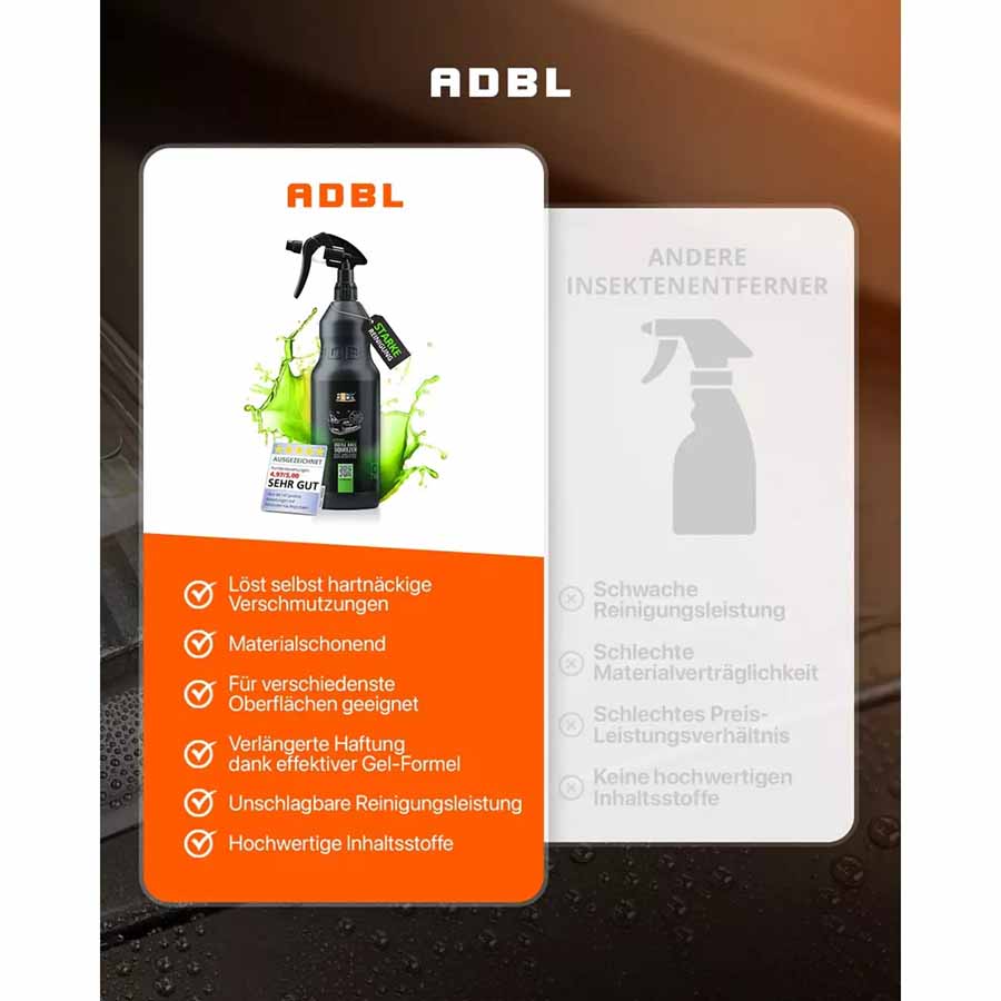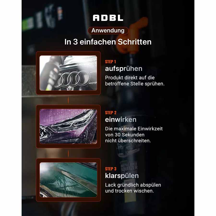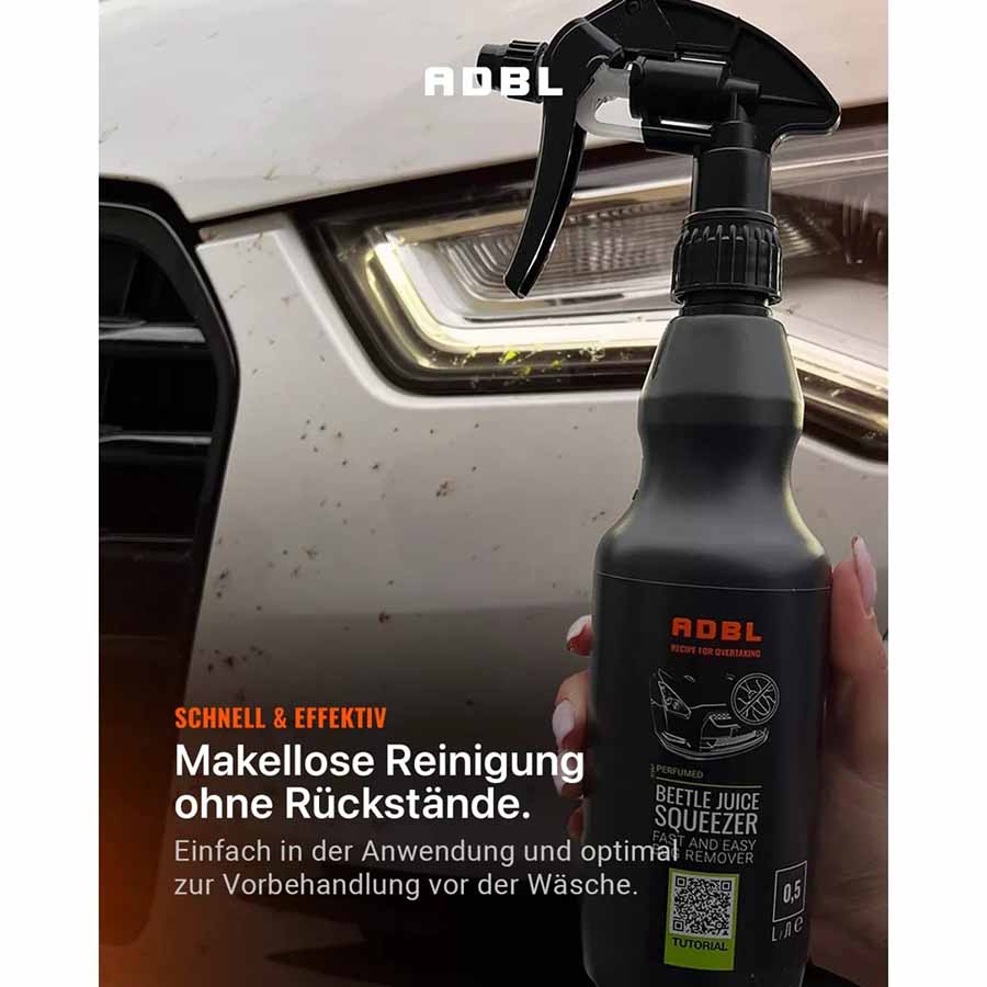 Vermeiden Sie die Anwendung auf heißen Oberflächen und schütteln Sie das Produkt vor Gebrauch gründlich. Sprühen Sie die betroffenen Flächen sorgfältig mit ADBL Beetle Juice Squeezer ein und spülen Sie sie anschließend gründlich mit klarem Wasser ab.