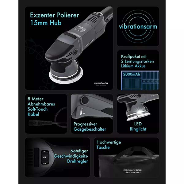 Die DA15 Pro verfügt über herausragende Merkmale, darunter 1000 Watt Leistung, 15mm exzentrischen Hub und eine Drehzahl von 3000-5300 U/Min. Dieses ultimative Werkzeug wurde für Profis und Enthusiasten entwickelt, die auf höchstem Niveau arbeiten. Besonderes Augenmerk wurde auf fortschrittliche Technologie und robuste Konstruktion gelegt.