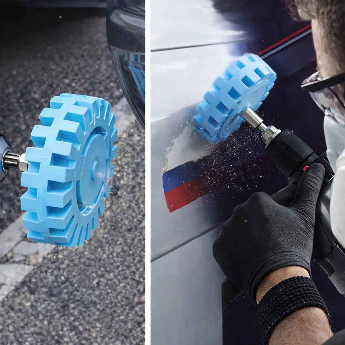 Montiere den ChemicalWorkz Foil Eraser Folienradierer mithilfe des Adapters auf einer Bohrmaschine oder einem Winkelschleifer. Arbeite mit niedriger Drehzahl und leichtem Druck, um eine Folie oder einen Kleberückstand gleichmäßig vom Lack zu entfernen. Teste die Anwendung vorab an einer unauffälligen Stelle, um optimale Ergebnisse sicherzustellen.