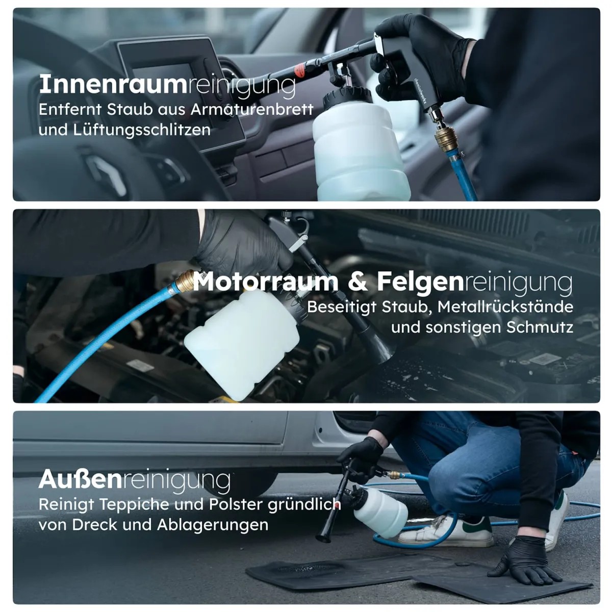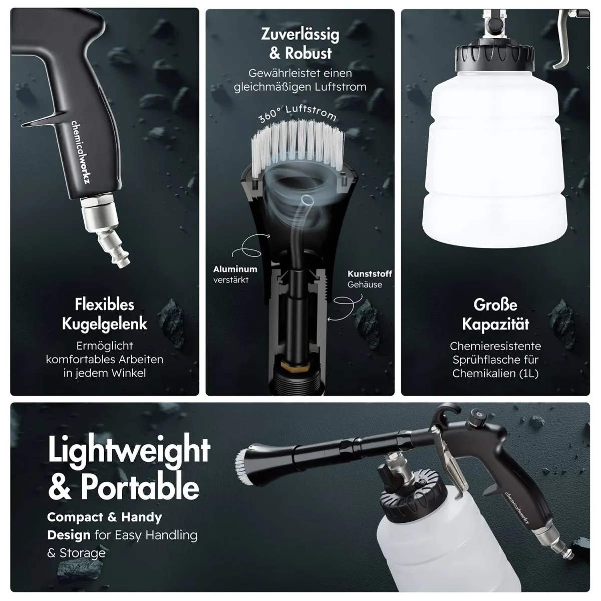 Die chemicalworkz AirGun Druckluft Reinigungspistole ermöglicht eine schnelle und gründliche Trockenreinigung selbst an schwer erreichbaren Stellen. Ob Lüftungsschlitze, Sitzschienen, Türablagefächer oder Reparaturteile – mit ihrem hohen Luftvolumenstrom und der kugelgelagerten Düse entfernt sie mühelos hartnäckigen Schmutz und sorgt für ein perfektes Reinigungsergebnis.Für maximale Flexibilität wird die AirGun mit zwei hochwertigen Trichtern geliefert:• ein Trichter mit Bürsten für intensive Reinigung• ein vormontierter Trichter ohne Bürsten für empfindliche BereicheMit einem Arbeitsdruck von 6–8 bar und einem Luftverbrauch von 120–160 L/min bietet die Reinigungspistole eine starke Leistung bei gleichzeitig geringem Gewicht von nur 385 g. Das ergonomische Design sorgt für komfortables Arbeiten, auch bei längeren Einsätzen.Produkteigenschaften:• zwei Trichter für unterschiedliche Reinigungsanforderungen• kugelgelagerte Düse für hohe Langlebigkeit und durchgängige Leistung• Arbeitsdruck: 6–8 bar• Luftverbrauch: 120–160 L/min• Gewicht: 385 g• ergonomischer Griff für komfortable HandhabungDie chemicalworkz AirGun ist ein unverzichtbares Werkzeug für professionelle Fahrzeugaufbereitung und Autopflege-Enthusiasten. Sie ermöglicht eine gründliche Reinigung schwer erreichbarer Bereiche und entfernt effizient Staub, Schmutz und Ablagerungen.Hinweis: Zur langfristigen Erhaltung der Leistung und Langlebigkeit wird empfohlen, die Reinigungspistole nach jedem Einsatz mit speziellem Öl für Druckluftgeräte zu pflegen. Dies sorgt für eine reibungslose Funktion und schützt die internen Komponenten vor Verschleiß.