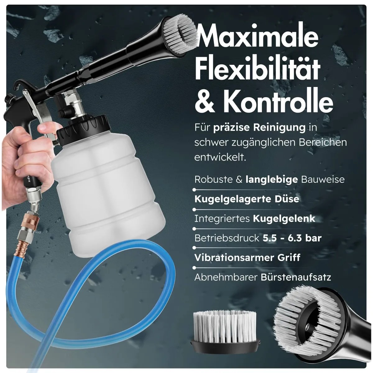 chemicalworkz Performance Cleaning Gun – Druckluft-Reinigungspistole für Profis Die chemicalworkz Performance Cleaning Gun ist das ultimative Werkzeug für kompromisslose Reinigungsergebnisse. Mit innovativer Impuls-Technologie und starker Leistung entfernt sie selbst hartnäckigste Verschmutzungen in kürzester Zeit. Ob Fahrzeugaufbereitung, Polster- und Teppichreinigung, Felgenpflege oder schwer zugängliche Stellen – diese Reinigungspistole setzt neue Maßstäbe in der professionellen Tiefenreinigung. Bereits ab einem Arbeitsdruck von nur 5,5 – 6,3 bar liefert die Cleaning Gun beeindruckende Resultate. Dank ihrer Flexibilität ist sie sowohl stationär mit festem Kompressor als auch mobil einsetzbar. Der ergonomisch geformte, kälteisolierte Griff sorgt dabei für höchsten Komfort, auch bei längeren Einsätzen – vibrationsarm und ermüdungsfrei. Ein integrierter Kugelgelenk-Luftanschluss ermöglicht maximale Beweglichkeit während der Arbeit. Zusätzlich verstärkt der abnehmbare Bürstenaufsatz die Reinigungsleistung bei besonders hartnäckigen Verschmutzungen. Die kugelgelagerte Düse garantiert eine langlebige, zuverlässige Performance – ideal für den täglichen Profi-Einsatz. Anwendung: Intensive Reinigung von Polstern, Teppichen, Fahrzeugteilen und schwer erreichbaren Bereichen Optimal einsetzbar bei PKW, LKW, Bussen, Nutzfahrzeugen und in der Industrie Impuls-Technologie für eine tiefenwirksame Reinigung selbst bei hartnäckigem Schmutz Produkteigenschaften: Arbeitsdruck: 5,5 – 6,3 bar Ergonomischer, kälteisolierter und vibrationsarmer Griff Kugelgelenk-Luftanschluss für maximale Flexibilität Abnehmbarer Bürstenaufsatz für hartnäckige Verschmutzungen Kugelgelagerte Düse für Langlebigkeit und durchgehende Performance Robust gebaut – ideal für den professionellen Dauereinsatz Hinweis: Für eine lange Lebensdauer und optimale Leistung von Druckluftwerkzeugen empfehlen wir, die Cleaning Gun nach jedem Arbeitstag mit speziellem Öl für Druckluftgeräte zu pflegen. So bleibt die Funktion geschmeidig und die internen Komponenten werden zuverlässig vor Verschleiß geschützt.