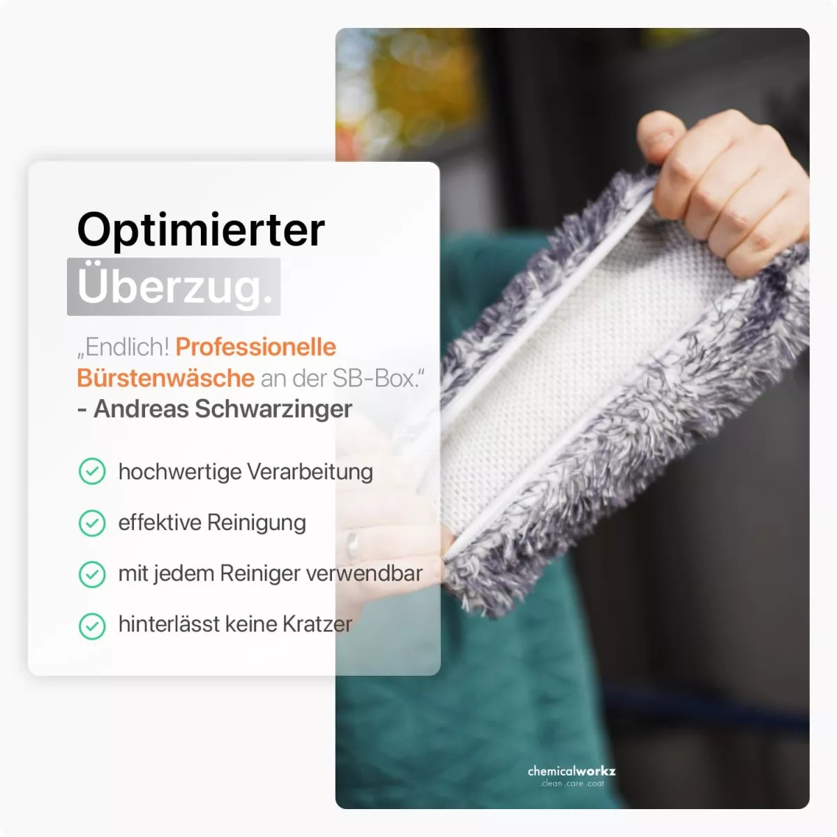 Das neue chemicalworkz Wash Brush Cover V2 ist ab sofort erhältlich und wurde weiterentwickelt, um eine noch präzisere Passform für Bürsten zu gewährleisten. Der optimierte Viskose-Einsatz im Inneren verhindert effektiv das Durchdringen der Borsten während des Waschens. Das Cover besteht aus hochwertigen, langen Plüsch-Mikrofasern, die Schmutz schonend und gründlich entfernen. Dank des integrierten Gummizugs lässt sich der Überzug mühelos anbringen. Mit dem chemicalworkz Wash Brush Cover V2 wird das Risiko von Kratzern durch eingeschlossene Schmutzpartikel in den Bürsten nochmals deutlich minimiert.