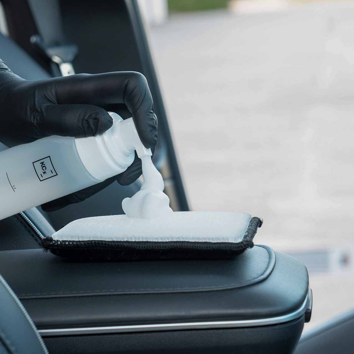 Den Leather Cleaner Mild in eine Foamer Bottle umfüllen. Den entstehenden Schaum auf einen Schwamm oder eine Bürste geben – niemals direkt auf das Leder. Das Leder gleichmäßig von Naht zu Naht reinigen und je nach Verschmutzung mehrfach wiederholen. Anschließend mit einem leicht feuchten Tuch Schmutz- und Reinigerreste aufnehmen und die Fläche vollständig trocknen lassen. Danach sollte das Leder mit einem geeigneten Pflegeprodukt geschützt werden.