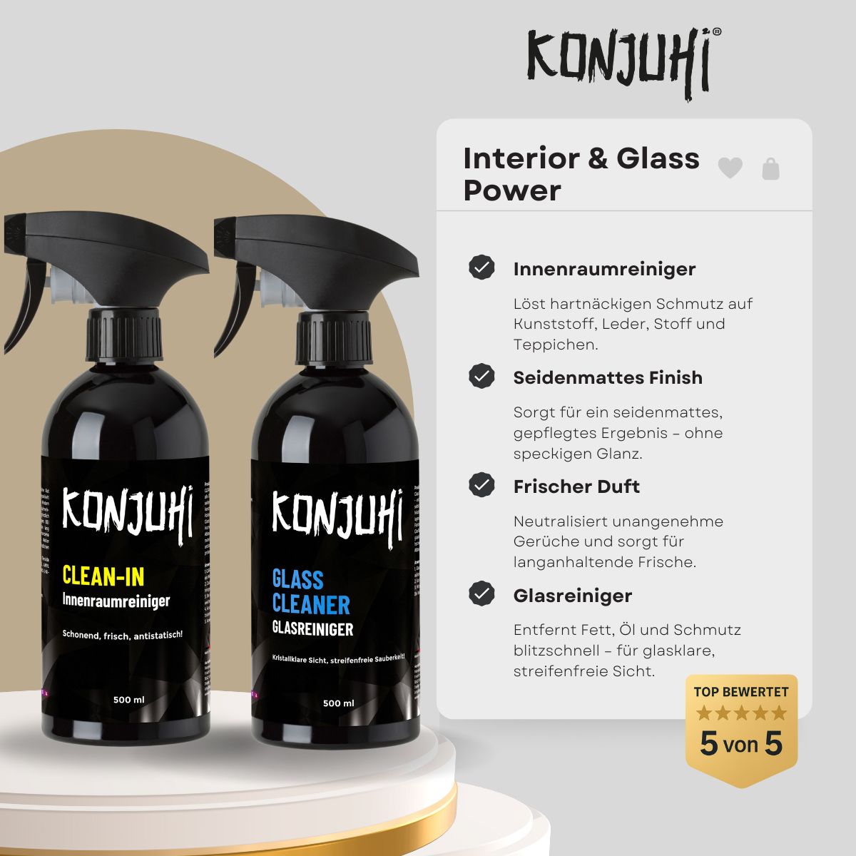 Suchst du nach dem besten Autopflege-Innenraumreinigerset? Dann bist du hier genau richtig!Das Auto Innenraumreiniger Set von KONJUHI bietet dir die perfekte Reinigung deines Innenraumes.Das Set deckt so gut wie das ganze Einsatzspektrum für den Innenraum ab. Einfach alles, was du benötigst. Schonende Reinigung Seidenmatter Glanz mit Frischeduft Geruchsvernichter Allround einsetzbar Für Cockpit, Armaturen, Polster, Teppiche, Sitze Geeignet für Alcantara, Leder, Stoff, Kunststoff etc. Kein speckiger Glanz oder klebrige Rückstände Gebrauchsfertige Glasreiniger entfernt mühelos hartnäckige Verschmutzungen Das Set enthält:1 x KONJUHI Clean-In Innenraumreiniger 500ml1 x KONJUHI Glass Cleaner Glasreiniger 500ml1 x KONJUHI Allrounder Towel 250GSM grau1 x KONJUHI Glastuch Clean Glassy1 x ChemicalWorkz Leather Cleaning Brush Falls du noch weitere Informationen zu den jeweiligen Produkten suchst, kannst du das jeweilige Produkt bei uns im Shop suchen, so findest du alle Informationen.