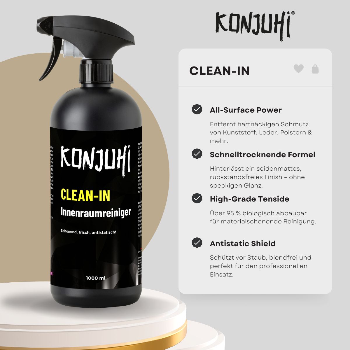CLEAN-IN ist ein leistungsstarker Innenraumreiniger für alle Oberflächen im Fahrzeug. Die schnelltrocknende, seidenmatte Formel entfernt mühelos hartnäckige Verschmutzungen von Kunststoff, Leder, Teppich, Polstern und weiteren Materialien ohne speckigen Glanz zu hinterlassen.Hochwertige Tenside mit einem biologischen Abbaugrad von über 95% sorgen für eine schonende, materialfreundliche Reinigung und hinterlassen einen antistatischen und blendfreien Schutzfilm. Ideal für eine professionelle, rückstandsfreie Innenraumpflege.Anwendungshinweise:CLEAN-IN direkt auf die verschmutzte Fläche oder auf ein Mikrofasertuch sprühen.Gleichmäßig verteilen und mit leichtem Druck reinigen.Bei stärkeren Verschmutzungen oder auf Leder eine weiche bis mittelharte Bürste verwenden.Anschließend die Fläche mit einem sauberen, trockenen Mikrofasertuch abwischen.Anwendung bei Bedarf wiederholen.Inhalt: 1000mlph-Wert: 8,5Kennzeichnung der Inhaltsstoffe:anionische Tenside <5% Duftstoffe (Terpentin, Öl, CITRONELLOL, AMYL CINNAMAL), Konservierungsmittel („2- BROMO-2-NITROPROPANE-1,3-DIOL“)
