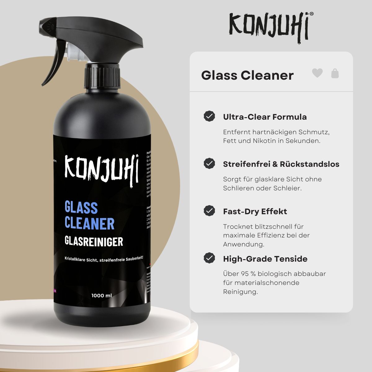 Dieses Set beinhaltet die perfekte Kombination für eine klare Sicht!Glass Cleaner ist ein hochwirksamer Glasreiniger für Glas - und Plexiglasflächen. Die kraftvolle Formel entfernt selbst hartnäckige Verschmutzungen wie Fett, Öl, Nikotin, Klebereste, Silikon und andere Schmutzablagerungen - streifenfrei und rückstandslos. Ideal für Fahrzeugscheiben, Spiegel und alle Arten von Glasflächen. Trocknet schnell und sorgt für eine glasklare, blendfreie Sicht.Er wirkt auf der Basis hochwertiger Lösemittel mit einem biologischen Abbaugrad von über 95%.Anwendungshinweise:Glass Cleaner gleichmäßig auf die Glasfläche aufsprühen.Kurz einwirken lassen.Mit einem sauberen, trockenen Glastuch abwischen. Bei Bedarf Vorgang wiederholen.Inhalt: 500mlph-Wert: 7,5 Lieferumfang:1 x KONJUHI Glass Cleaner Glasreiniger 500ml1 x KONJUHI Glastuch Clean Glassy 40x40cm Falls du noch weitere Informationen zu den jeweiligen Produkten suchst, kannst du das jeweilige Produkt bei uns im Shop suchen, so findest du alle Informationen.