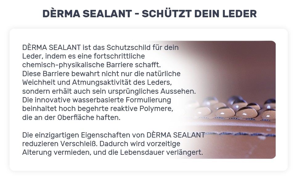 Dèrma Sealant bietet eine fortschrittliche Lösung zur Lederpflege und -schutz. Durch die chemisch-physikalische Barriere, die das Produkt bildet, bleibt die natürliche Weichheit, Atmungsaktivität und das ursprüngliche Aussehen des Leders erhalten. Es schützt vor Verschleiß, Farbübertragung und vorzeitiger Alterung und verlängert so die Lebensdauer des Leders.