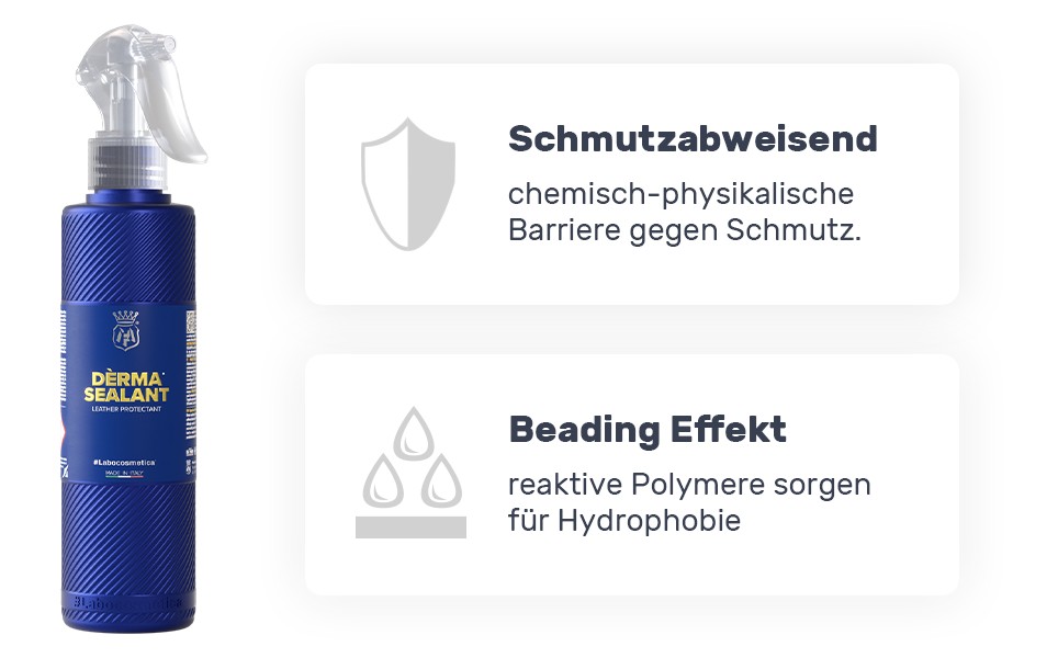 Zusätzlich bietet Dèrma Sealant eine stark hydrophobe Wirkung mit einem Kontaktwinkel von 120°, was bedeutet, dass Wasser und Schmutz nicht in das Material eindringen können und leicht abperlen. Dadurch bleibt das Leder immer sauber und geschützt. Das Produkt schützt auch effektiv vor Farbübertragung von Stoffen und Jeans, die häufig auf Lederoberflächen abfärben.