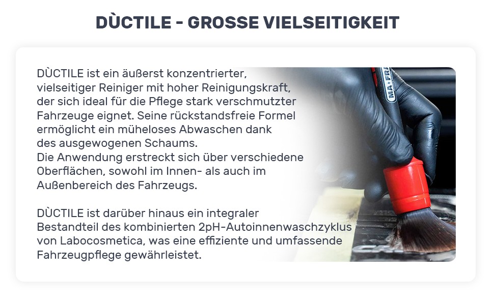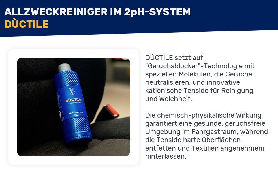 Für die Reinigung von Kunststoffen wird Dùctile mit einer Bürste oder einem Pinsel aufgetragen, um einen leichten Schaum zu erzeugen. Dieser kann einfach mit einem Mikrofasertuch entfernt werden. Die integrierte Odor Block-Technologie neutralisiert unangenehme Gerüche im Fahrzeuginnenraum und sorgt für einen langanhaltend frischen Duft.