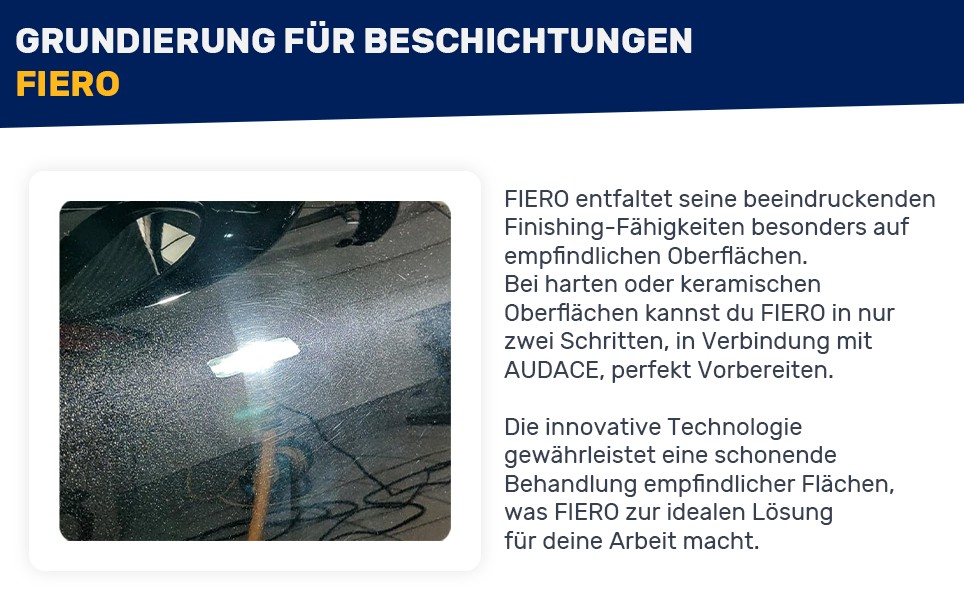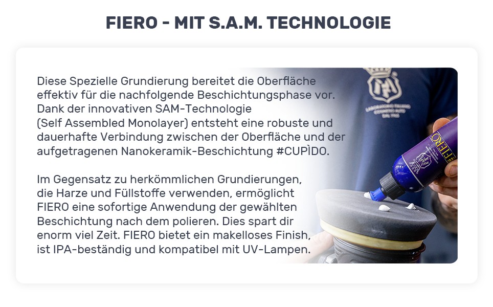 Die innovative S.A.M. (Self Assembled Monolayer) Technologie sorgt für eine starke, dauerhafte Verbindung zwischen der Oberfläche und der aufgetragenen Nanokeramikbeschichtung. Im Vergleich zu herkömmlichen Primern, die lange Bindungszeiten erfordern, ermöglicht Fiero das sofortige Beschichten direkt nach der Endbearbeitung – für eine deutliche Zeitersparnis.
