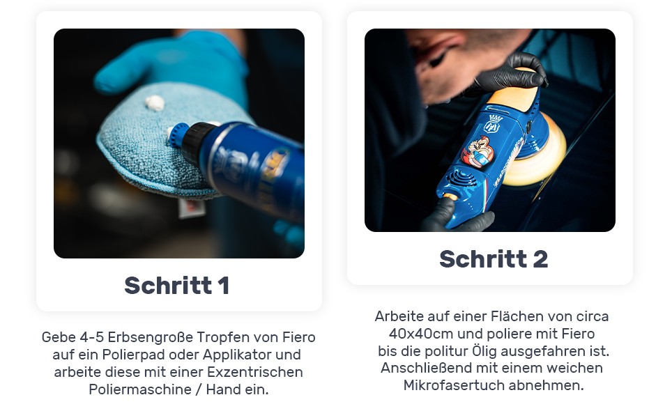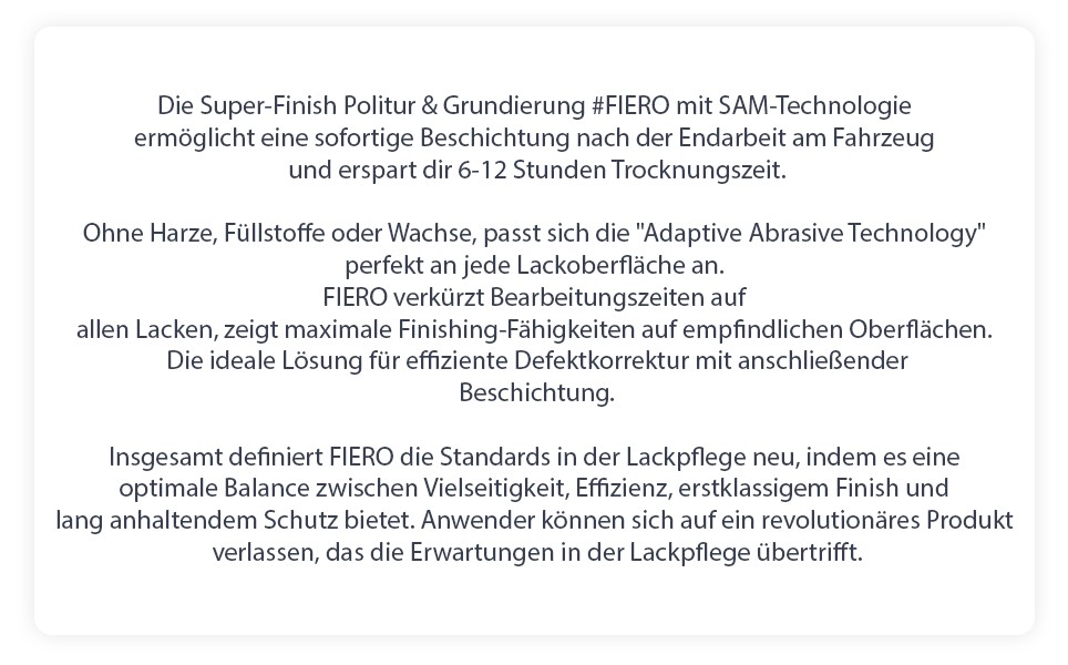 Fiero ist frei von Harzen, Füllstoffen und Wachsen. Stattdessen enthält es präzise ausgewählte synthetische Schleifmittel mit der innovativen „Adaptive Abrasive Technology“, die sich dem Lack anpasst und auf weichen wie harten Oberflächen ein perfektes Finish liefert.