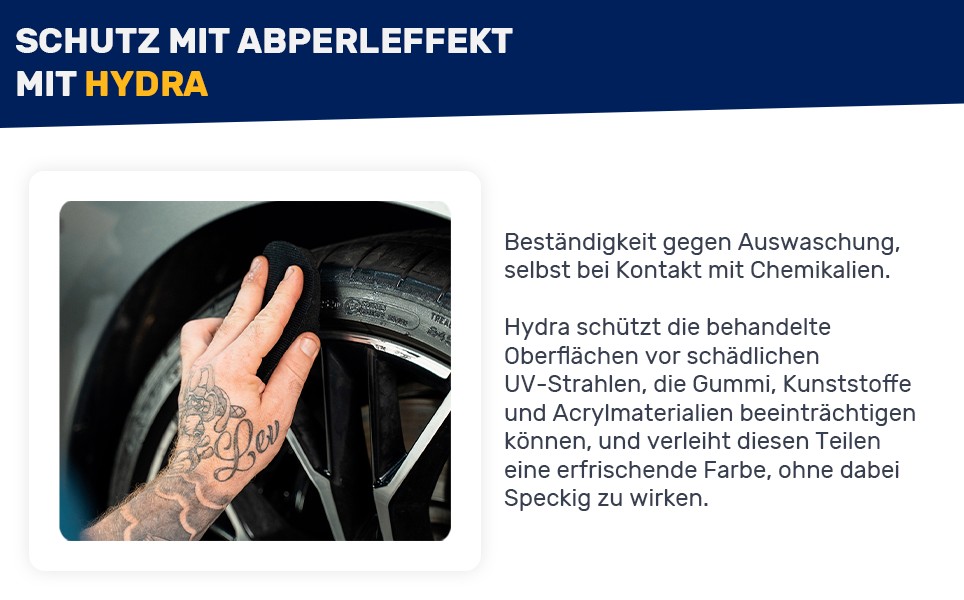 Dank der wasserbasierten Formel ohne Lösungsmittel ist Hydra besonders materialschonend, hinterlässt keine Flecken oder Verfärbungen und bietet eine hohe Beständigkeit gegen Wasser, Schmutz und chemische Reinigungsmittel. Die hydrophobe Wirkung sorgt zudem für einen beeindruckenden Abperleffekt.