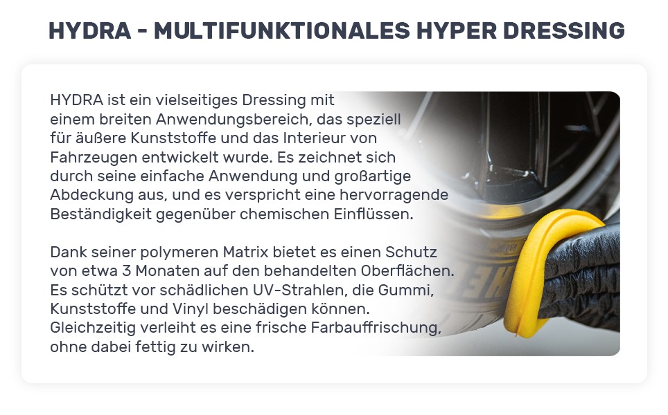 Labocosmetica Hydra ist ein vielseitiges Hyper-Dressing für Innen- und Außenkunststoffe, das sich leicht auftragen lässt und für langanhaltenden Schutz sorgt. Die innovative Polymermatrix bietet bis zu drei Monate Haltbarkeit, schützt Gummi, Vinyl, Leder und Kunststoffe vor UV-Strahlen und frischt die Farben auf, ohne einen fettigen Film zu hinterlassen.