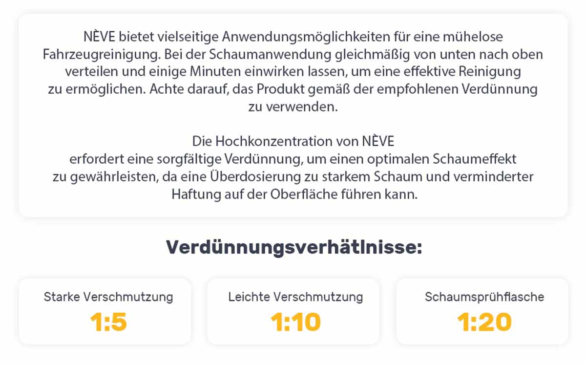 Die biologisch leicht abbaubaren Tenside ohne Phosphate sorgen für dichten, lang haftenden Schaum, der Schmutz, Staub und Straßenablagerungen effektiv anlöst. Nève haftet lange auf der Oberfläche, arbeitet gründlich und reduziert das Risiko von Mikrokratzern während der anschließenden Handwäsche.