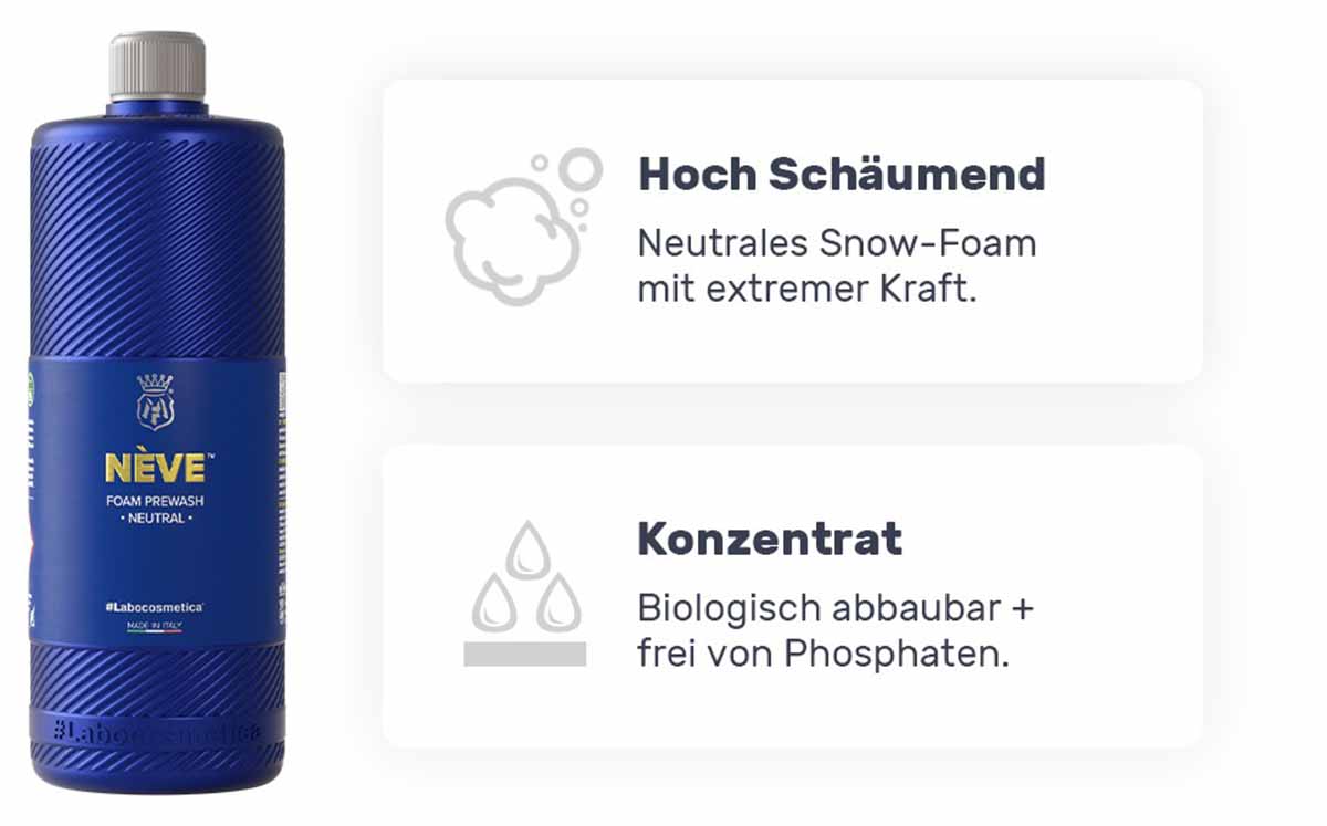 Labocosmetica Nève ist die ideale Wahl für eine sichere, leistungsstarke und gleichzeitig schonende Vorwäsche – auch bei empfindlichen Fahrzeugen.