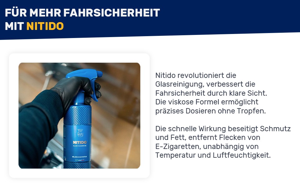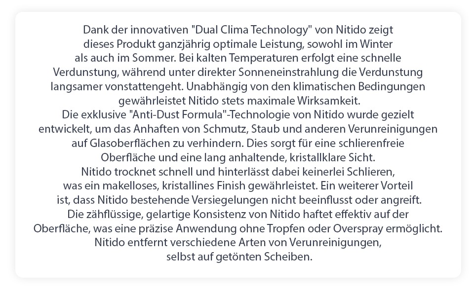 Die Anti-Staub-Formel verhindert das Anhaften von Schmutzpartikeln und sorgt für eine langanhaltende, streifenfreie Reinigung. Die gelartige Konsistenz ermöglicht eine präzise Anwendung, haftet länger auf der Oberfläche und verhindert Tropfenbildung oder Sprühnebel. Nitido entfernt zuverlässig Wasserflecken, Staub, Schmutz, Pollen, Fett, Insektenrückstände und Rückstände von E-Zigaretten, ohne bestehende Glasversiegelungen zu beeinträchtigen.