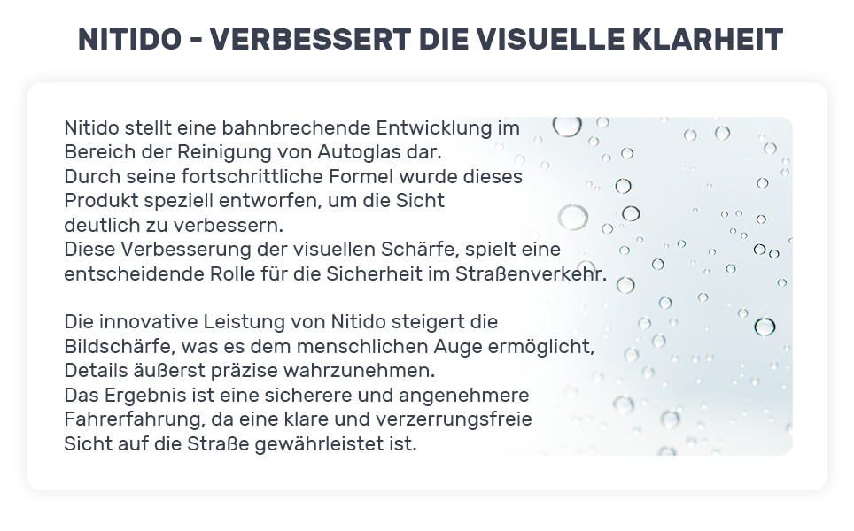 Nitido ist ein innovativer Glasreiniger, der für maximale Klarheit und verbesserte Sicht sorgt. Die fortschrittliche Formel optimiert die Lichtdurchlässigkeit und steigert die visuelle Präzision, sodass die Straße schärfer und unverzerrt wahrgenommen wird. Die speziell entwickelte "Klarheitspower" verbessert die Bilddefinition und trägt zu einer sicheren Fahrt bei.