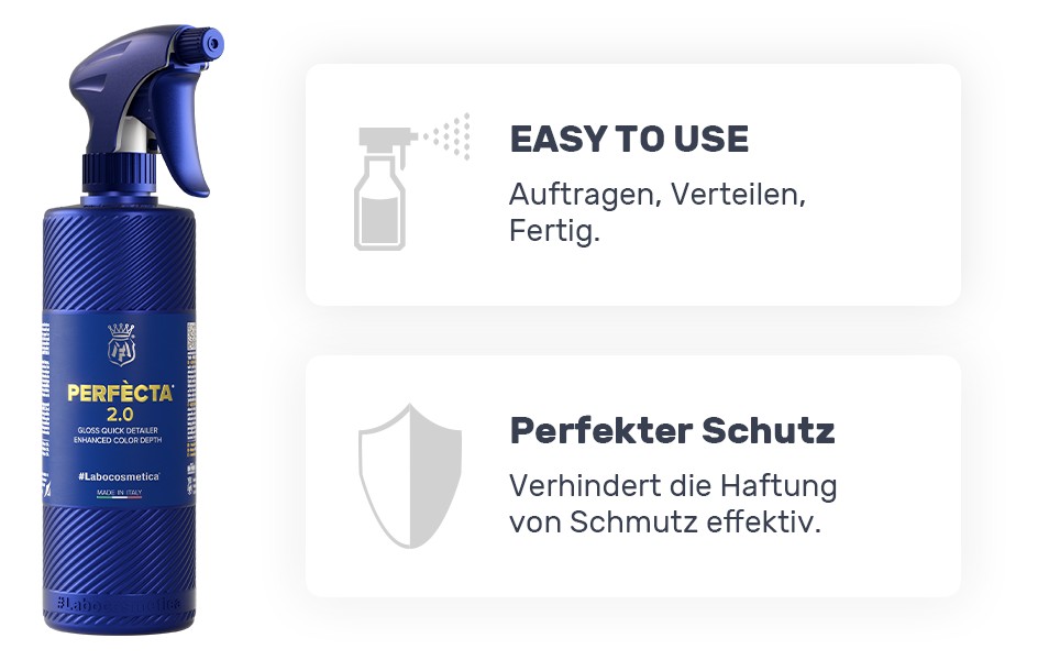 Labocosmetica Perfècta ist das perfekte Detailer-Produkt für alle, die ein makelloses Finish mit Satin-Effekt, intensiver Farbtiefe und zuverlässigem Oberflächenschutz wünschen. Die fortschrittliche Formel entfernt Wasserspritzer, leichten Schmutz und Insektenrückstände in kürzester Zeit – ganz ohne Wasser. Gleichzeitig hinterlässt sie einen seidenweichen Glanz auf Lack, Chrom, Glas, Dichtungen und weiteren Oberflächen.