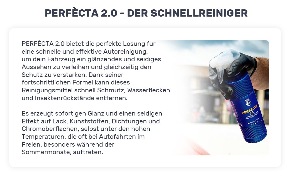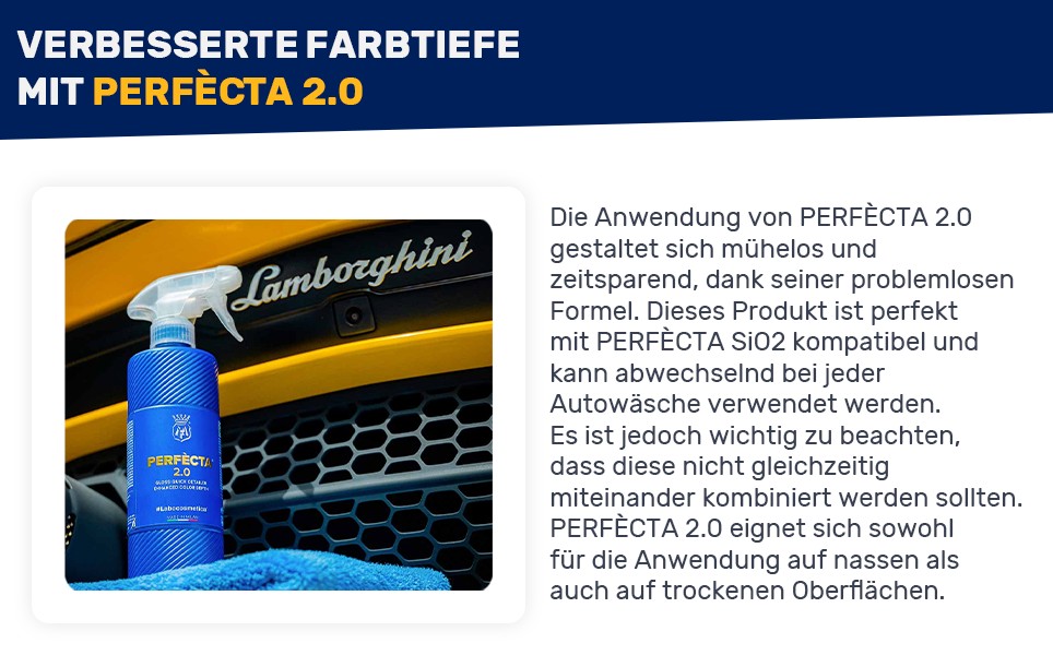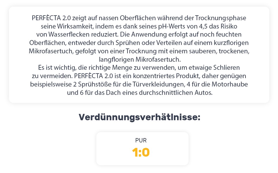 Dank seiner materialschonenden Eigenschaften ist Perfècta ideal für versiegelte oder nanobeschichtete Fahrzeuge geeignet. Jede Anwendung verstärkt den Schutzfilm und minimiert die Gefahr unschöner Wasserflecken – für ein dauerhaft gepflegtes Erscheinungsbild.