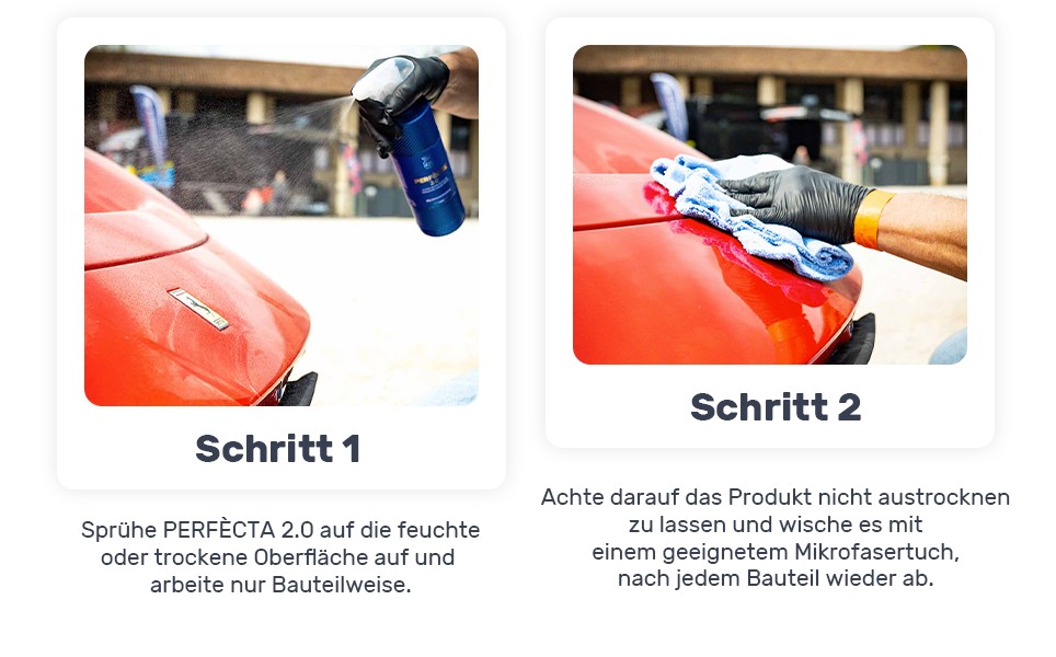 Perfècta kann auf trockenen und nassen Oberflächen verwendet werden. Einfach auf ein Mikrofasertuch oder direkt auf die zu behandelnde Fläche sprühen, gleichmäßig verteilen und sofort mit einem sauberen Tuch trocknen. Jede Anwendung intensiviert den Schutz.