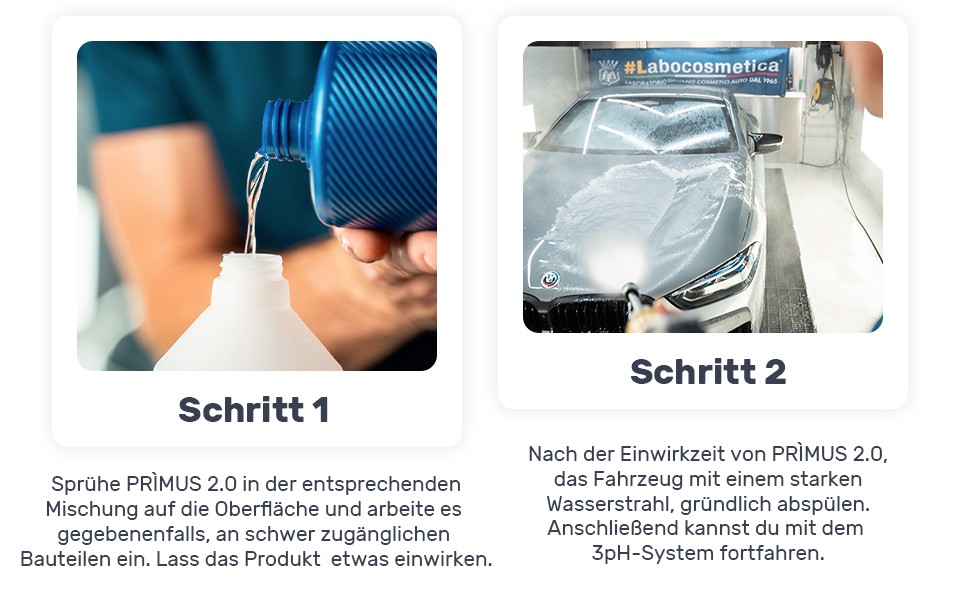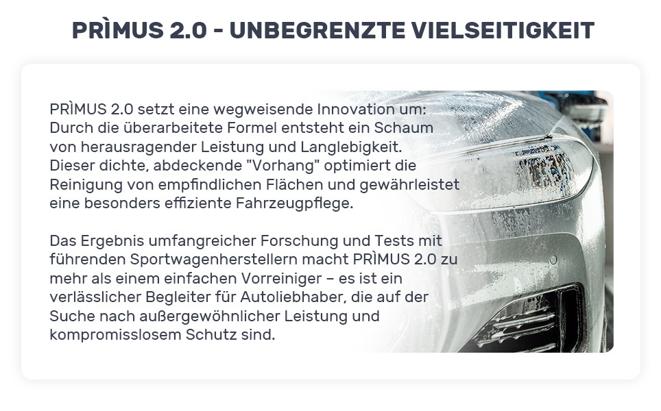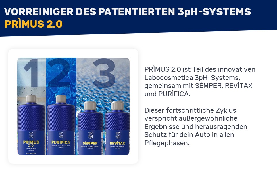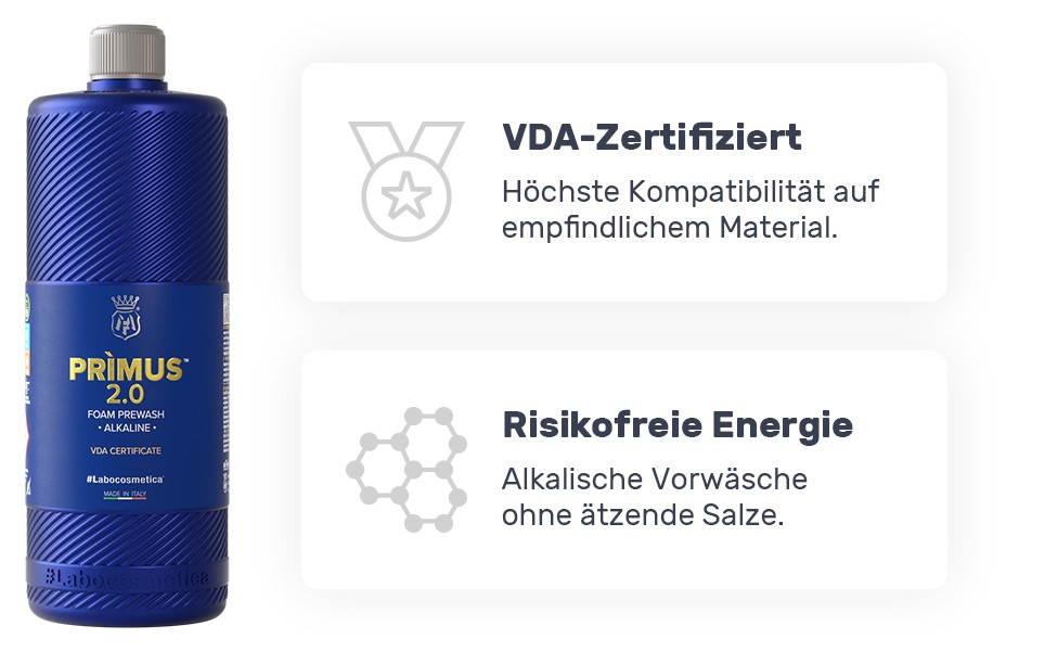 Labocosmetica PRÌMUS 2.0 setzt neue Maßstäbe in der Fahrzeugvorwäsche und bietet außergewöhnliche Reinigungsleistung für Autos und Motorräder. Als weltweit erste Vorwäsche mit VDA-Zertifizierung garantiert PRÌMUS 2.0 höchste Materialverträglichkeit und maximale Effizienz. Die weiterentwickelte Formel überzeugt mit noch besserer Schaumbildung, längerer Einwirkzeit und optimierter Reinigungswirkung – ideal für professionelle Fahrzeugaufbereitung und Autopflege-Enthusiasten.