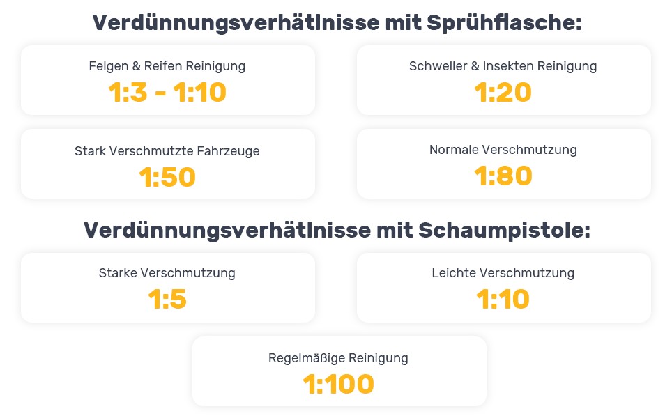 Für hartnäckigen Winterdreck Verdünnung 1:5, für wöchentliche Sommerreinigung 1:10. Nach dem Auftragen einige Minuten einwirken lassen und anschließend mit Hochdruck abspülen für optimale Ergebnisse.