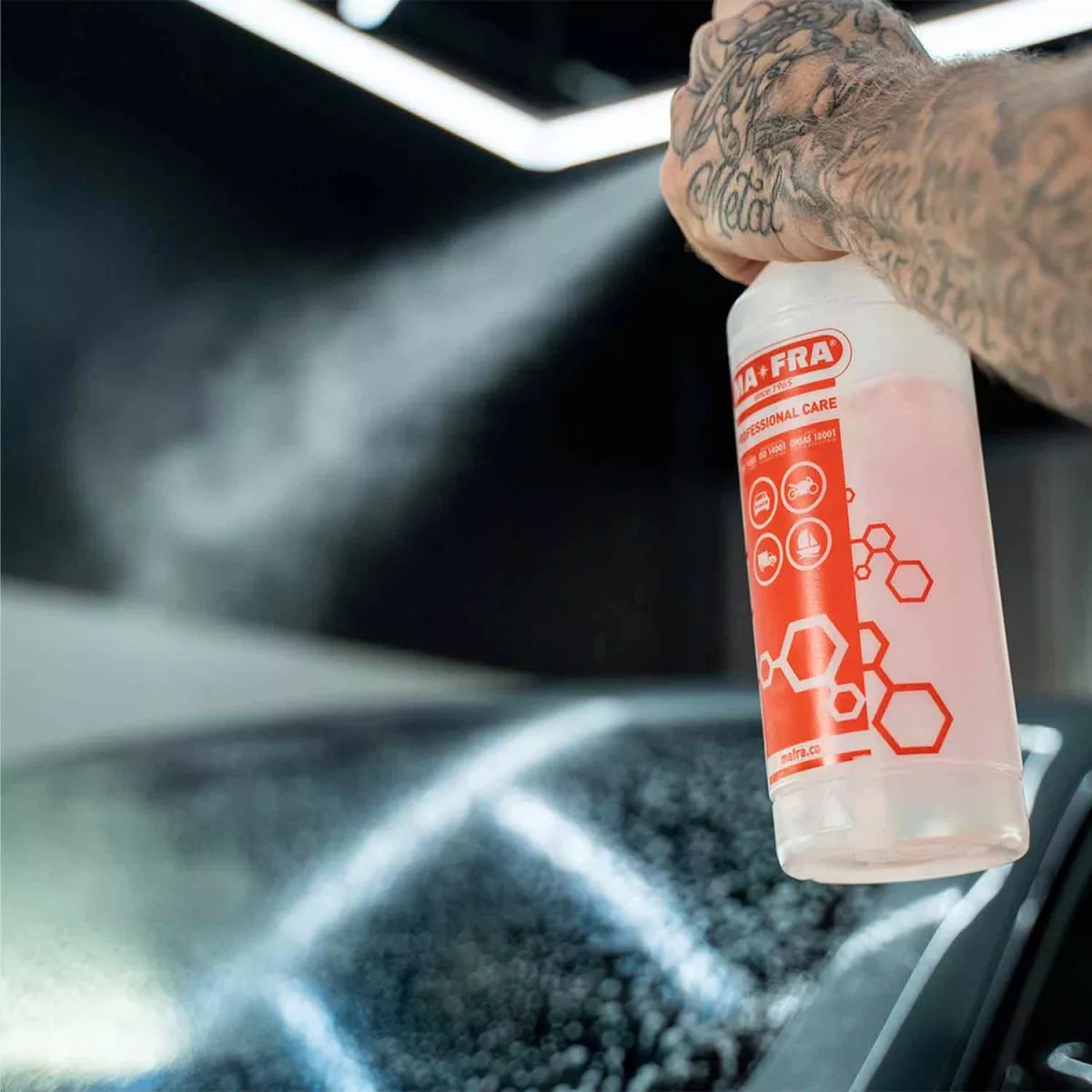 Labocosmetica LIMPIA – Spezialreiniger für PPF- & matte Fahrzeugfolien Labocosmetica LIMPIA ist ein hochentwickelter Reiniger speziell für PPF-Folien, matte Fahrzeugfolien und empfindliche Vinyloberflächen. Die einzigartige Formel entfernt tiefsitzende, unsichtbare Verschmutzungen aus mikroskopischen Poren hitzereaktiver Schutzfolien, ohne aggressive Lösungsmittel, Abrasive oder scharfe Tenside zu verwenden. LIMPIA wirkt wie eine technische Reinigungsmilch: sanft zur Oberfläche, aber kraftvoll gegen eingebetteten Schmutz. Die Tiefenreinigung erhält Elastizität, Transparenz und Selbstheilungsfähigkeit der Folie und schützt die chemisch-physikalische Struktur. Ideal für saisonale Tiefenreinigung oder regelmäßige Pflege für ein langanhaltend klares, neuwertiges Finish. Anwendung Flasche gut schütteln Direkt auf die Folienfläche aufsprühen Mit Mikrofasertuch gleichmäßig verteilen und sanft einarbeiten Mit sauberem Tuch abwischen – kein Abspülen notwendig Bei großflächiger Anwendung Nachspülen mit Wasser empfohlen Produkteigenschaften Gebinde: 500 ml Ideal für PPF, matte Folien, Vinylfolien & hitzeempfindliche Oberflächen Entfernt tief eingebetteten Schmutz durch kapillare Tiefenreinigung Ohne Lösungsmittel, Abrasive und aggressive Tenside Erhält Selbstheilungsfunktion & Elastizität der Folie Kompatibel mit Wachsen, Coatings & Schutzprodukten Kein Abspülen erforderlich – einfach aufsprühen & abwischen Auch für Spot-Cleaning und mobile Aufbereitung geeignet Hinweis Bei starker oder großflächiger Verschmutzung kann Nachspülen mit Wasser sinnvoll sein. Für kleinere Flächen reicht das Abwischen mit Mikrofasertuch völlig aus.