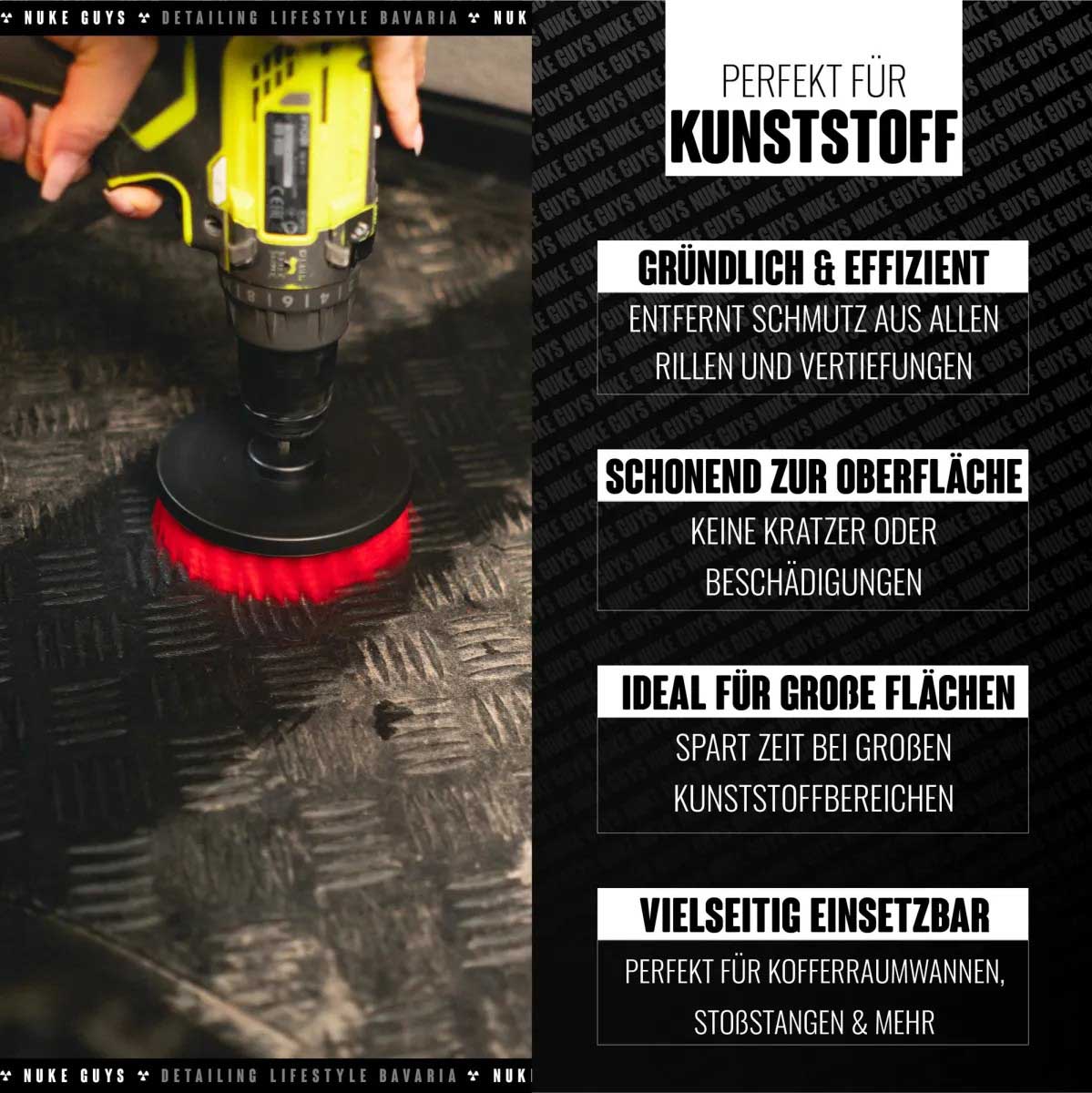 Die Nuke Guys Bürstenaufsätze mit harten Borsten sind die perfekte Wahl, um stark verschmutzte Oberflächen gründlich zu reinigen. Sie entfernen zuverlässig Schmutz- und Schlammrückstände und lösen hartnäckige Ablagerungen von Autopolstern, Felgen, Teppichen, Fliesen und Gartenmöbeln.
