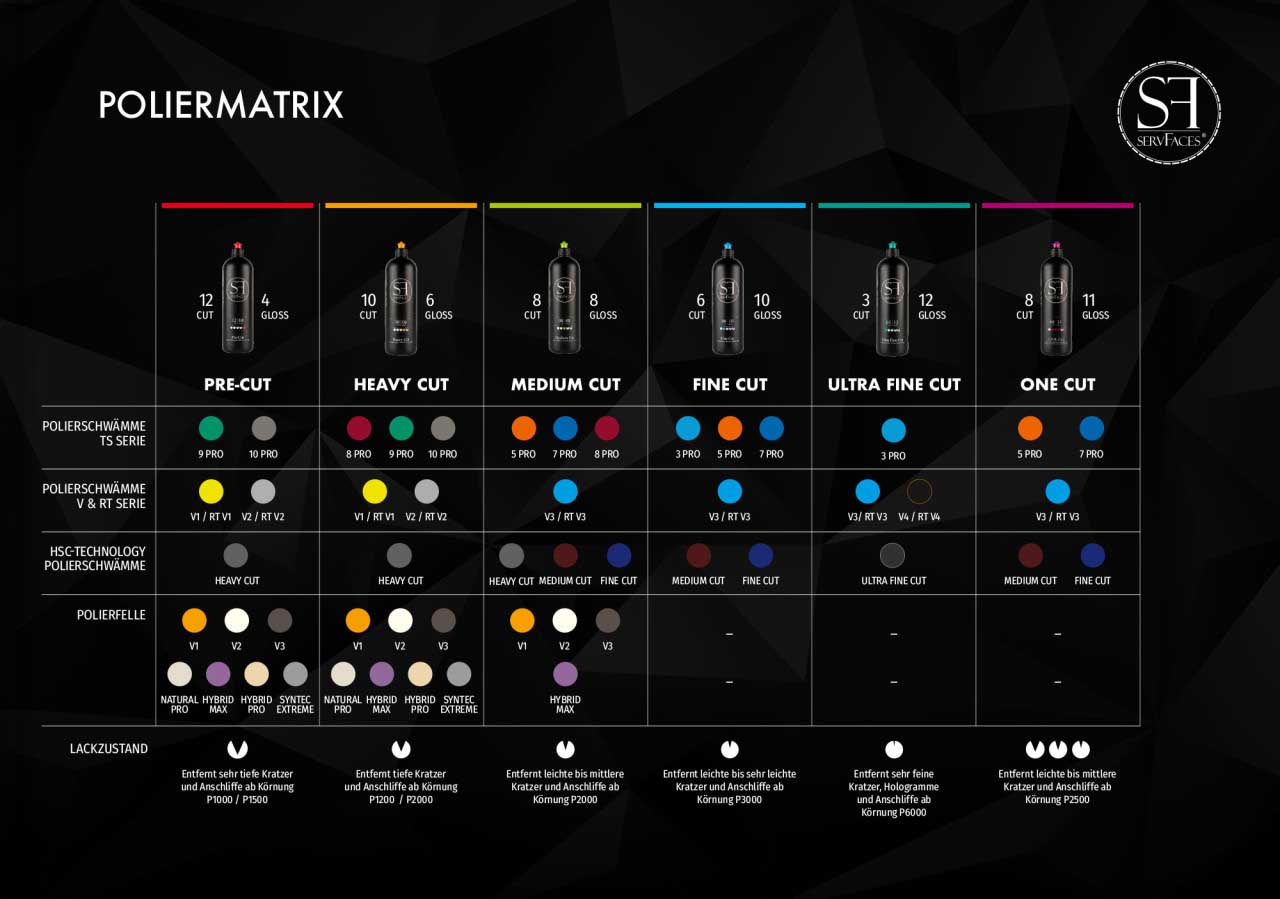 Das servFaces Sortiment deckt sämtliche Bereiche der Fahrzeugpflege ab – von effizienten Reinigern über abgestimmte Pflegeprodukte bis hin zu langlebigen Versiegelungen und Coatings. Die Produkte sind auf reproduzierbare Ergebnisse, Materialverträglichkeit und klare Arbeitsprozesse ausgelegt und eignen sich für Lack, Felgen, Glas, Kunststoff sowie weitere Fahrzeugoberflächen.
