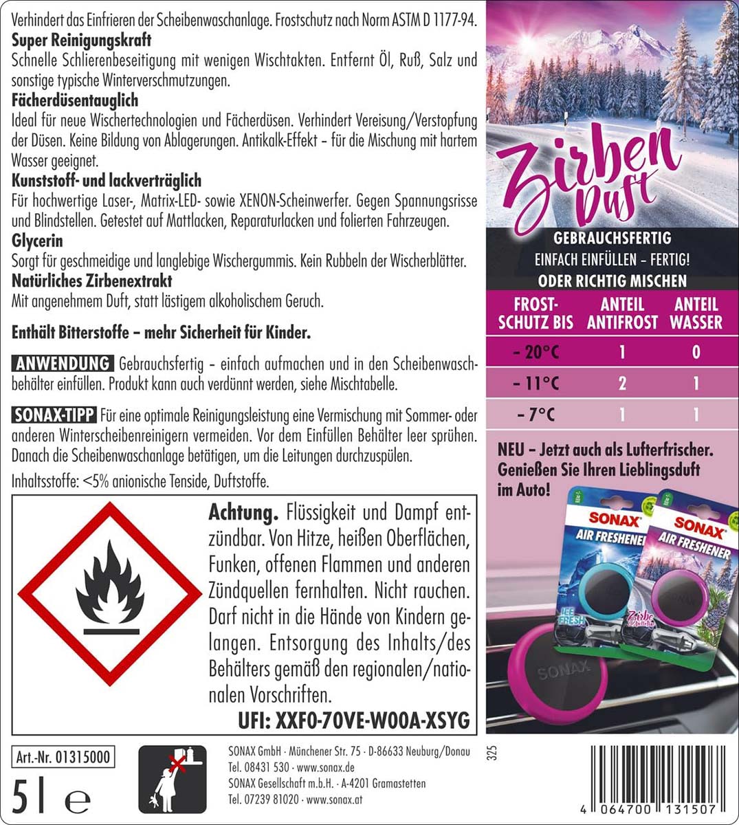 Der Scheibenreiniger AntiFrost+KlarSicht bis -20 °C Zirbe stammt aus dem Hause Sonax und ist speziell für die Wintermonate entwickelt worden. Dieses Produkt für die Scheibenwaschanlage überzeugt nicht nur durch seine herausragende Leistung, sondern auch durch einen angenehmen Zirben-Duft.