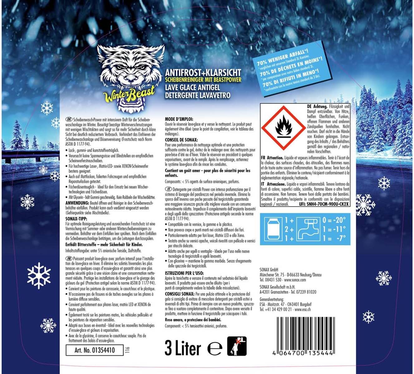 Scheibenreiniger mit intensivem Duft für die Scheibenwaschanlage im Winter. Beseitigt Öl, Ruß, Salz und sonstige typische Winterverschmutzungen mit wenigen Wischtakten und damit reduziertem Verbrauch. Verhindert Düsenvereisung und das Einfrieren der Scheibenwaschanlage. Absolut lack-, gummi- und kunststoffverträglich. Verursacht keine Spannungsrisse und Blindstellen an Scheinwerferstreuscheiben. Bestens geeignet für hochwertige Laser-, Matrix-LED- sowie XENON-Scheinwerfer. Getestet auf Mattlacken, folierten Fahrzeugen und empfindlichen Reparaturlacken. Mit Glycerin. Hält Gummi geschmeidig. Kein Rubbeln der Wischerblätter. Fächerdüsentauglich - auch ideal für den Einsatz bei neuen Wischertechnologien.