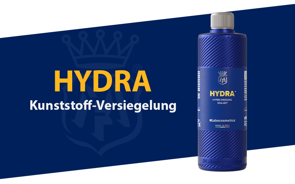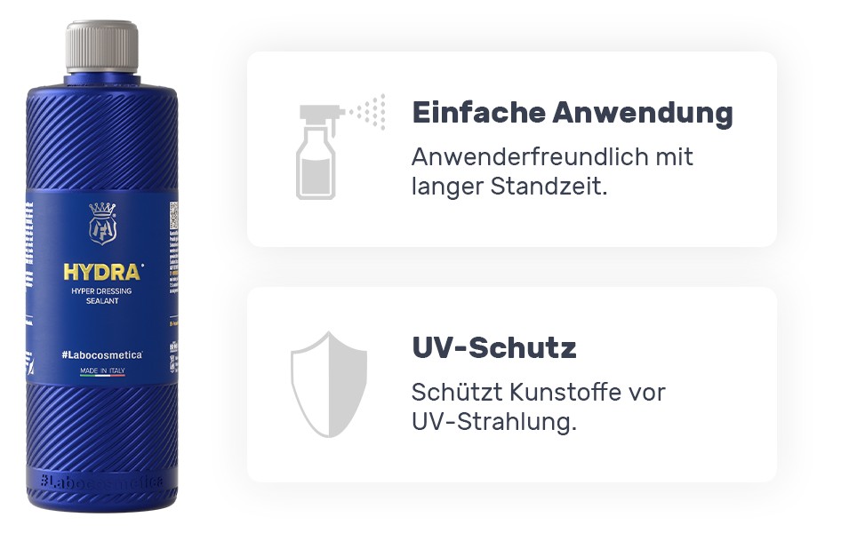 Labocosmetica Hydra ist ein vielseitiges Hyper-Dressing für Innen- und Außenkunststoffe, das sich leicht auftragen lässt und für langanhaltenden Schutz sorgt. Die innovative Polymermatrix bietet bis zu drei Monate Haltbarkeit, schützt Gummi, Vinyl, Leder und Kunststoffe vor UV-Strahlen und frischt die Farben auf, ohne einen fettigen Film zu hinterlassen.