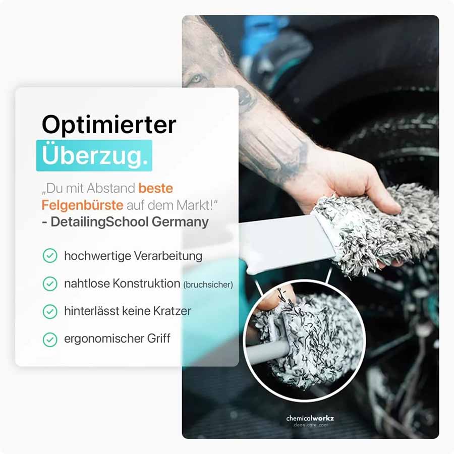 Das neue chemicalworkz Wash Brush Cover V2 ist ab sofort erhältlich und wurde weiterentwickelt, um eine noch präzisere Passform für Bürsten zu gewährleisten. Der optimierte Viskose-Einsatz im Inneren verhindert effektiv das Durchdringen der Borsten während des Waschens. Das Cover besteht aus hochwertigen, langen Plüsch-Mikrofasern, die Schmutz schonend und gründlich entfernen. Dank des integrierten Gummizugs lässt sich der Überzug mühelos anbringen. Mit dem chemicalworkz Wash Brush Cover V2 wird das Risiko von Kratzern durch eingeschlossene Schmutzpartikel in den Bürsten nochmals deutlich minimiert.Dieses Produkt wird in enger Zusammenarbeit mit einer renommierten koreanischen Produktionsstätte gefertigt und erfüllt höchste Qualitätsstandards durch den Einsatz erstklassiger Garne und sorgfältiger Verarbeitung. Es überzeugt durch seine herausragende Haltbarkeit und lange Lebensdauer.Alle Produkte von chemicalworkz bieten dir hervorragende Reinigungsergebnisse und sind wiederverwendbar sowie maschinenwaschbar. Sie eignen sich ideal zur Reinigung von Außenflächen und zur gründlichen Pflege des Fahrzeuginnenraums. Die Lieferung erfolgt in einem umweltfreundlichen, wiederverschließbaren Druckverschlussbeutel, der das Produkt zuverlässig vor Schmutz, Feuchtigkeit, Staub und UV-Strahlung schützt.Produkteigenschaften:Farbe: GrauMaße: 17 × 25 cmMaterial: Hochwertige Korea-FaserGrammatur: 1400 GSM (g/m²)Zusammensetzung: 94% Polyester / 6% Viskose (100% Mikrofaser)Verpackung: Umweltfreundlicher, wiederverschließbarer DruckverschlussbeutelTipp:Damit deine Mikrofaserprodukte lange haltbar bleiben, beachte bitte folgende Pflegeempfehlungen: Maschinenwäsche bei maximal 40°C, ein spezielles Mikrofaserwaschmittel verwenden, keinen Weichspüler nutzen, nicht im Trockner trocknen und nicht bügeln.