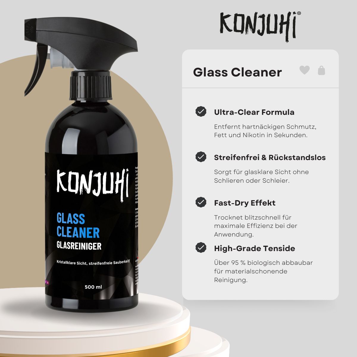 Dieses Set beinhaltet die perfekte Kombination für eine klare Sicht!Glass Cleaner ist ein hochwirksamer Glasreiniger für Glas - und Plexiglasflächen. Die kraftvolle Formel entfernt selbst hartnäckige Verschmutzungen wie Fett, Öl, Nikotin, Klebereste, Silikon und andere Schmutzablagerungen - streifenfrei und rückstandslos. Ideal für Fahrzeugscheiben, Spiegel und alle Arten von Glasflächen. Trocknet schnell und sorgt für eine glasklare, blendfreie Sicht.Er wirkt auf der Basis hochwertiger Lösemittel mit einem biologischen Abbaugrad von über 95%.Anwendungshinweise:Glass Cleaner gleichmäßig auf die Glasfläche aufsprühen.Kurz einwirken lassen.Mit einem sauberen, trockenen Glastuch abwischen. Bei Bedarf Vorgang wiederholen.Inhalt: 500mlph-Wert: 7,5 Lieferumfang:1 x KONJUHI Glass Cleaner Glasreiniger 500ml1 x KONJUHI Glastuch Clean Glassy 40x40cm Falls du noch weitere Informationen zu den jeweiligen Produkten suchst, kannst du das jeweilige Produkt bei uns im Shop suchen, so findest du alle Informationen.