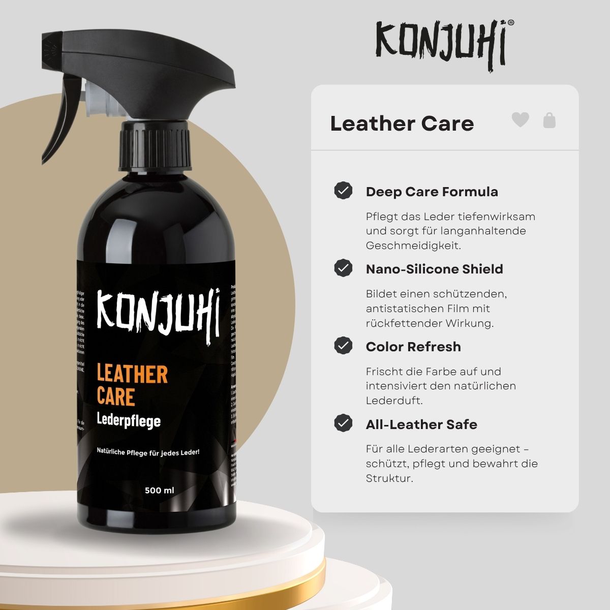 Leather Care ist die ideale Lederpflege für den Fahrzeuginnenraum. Dank einer hochaktiven Wirkformel mit speziell entwickelten Nanosilikonen bietet das Produkt eine optimale und langanhaltende Pflege - perfekt abgestimmt auf die Anforderungen verschiedenster Lederarten. Die Pflegeformel sorgt für ein farbauffrischendes, geschmeidiges Ergebnis und intensiviert den natürlichen Lederduft. Leather Care dringt tief in die Poren des Leders ein und hinterlässt einen rückfettenden, antistatischen Schutz- film. Geeignet für alle Lederarten, bietet Leather Care die nötige Pflege und sorgt für eine angenehm weiche Haptik.Anwendungshinweise:Leather Care sparsam auf ein sauberes Mikrofasertuch, einen Schwamm oder Applikator auftragen.Gleichmäßig auf die zuvor gereinigte Lederoberfläche einarbeiten.Ein Nachwischen ist bei richtiger Dosierung nicht erforderlich.Hinweis:Das Produkt enthält keine Reinigungszusätze. Für die Vorreinigung empfehlen wir den passenden Innenraumreiniger KONJUHI CLEAN-IN. Inhalt: 500mlKennzeichnung der Inhaltsstoffe: Konservierungsmittel (BENZISOTHIAZOLINONE, METHYLISOTHIAZOLINONE, METHYLISOTHIAZOLINONE)