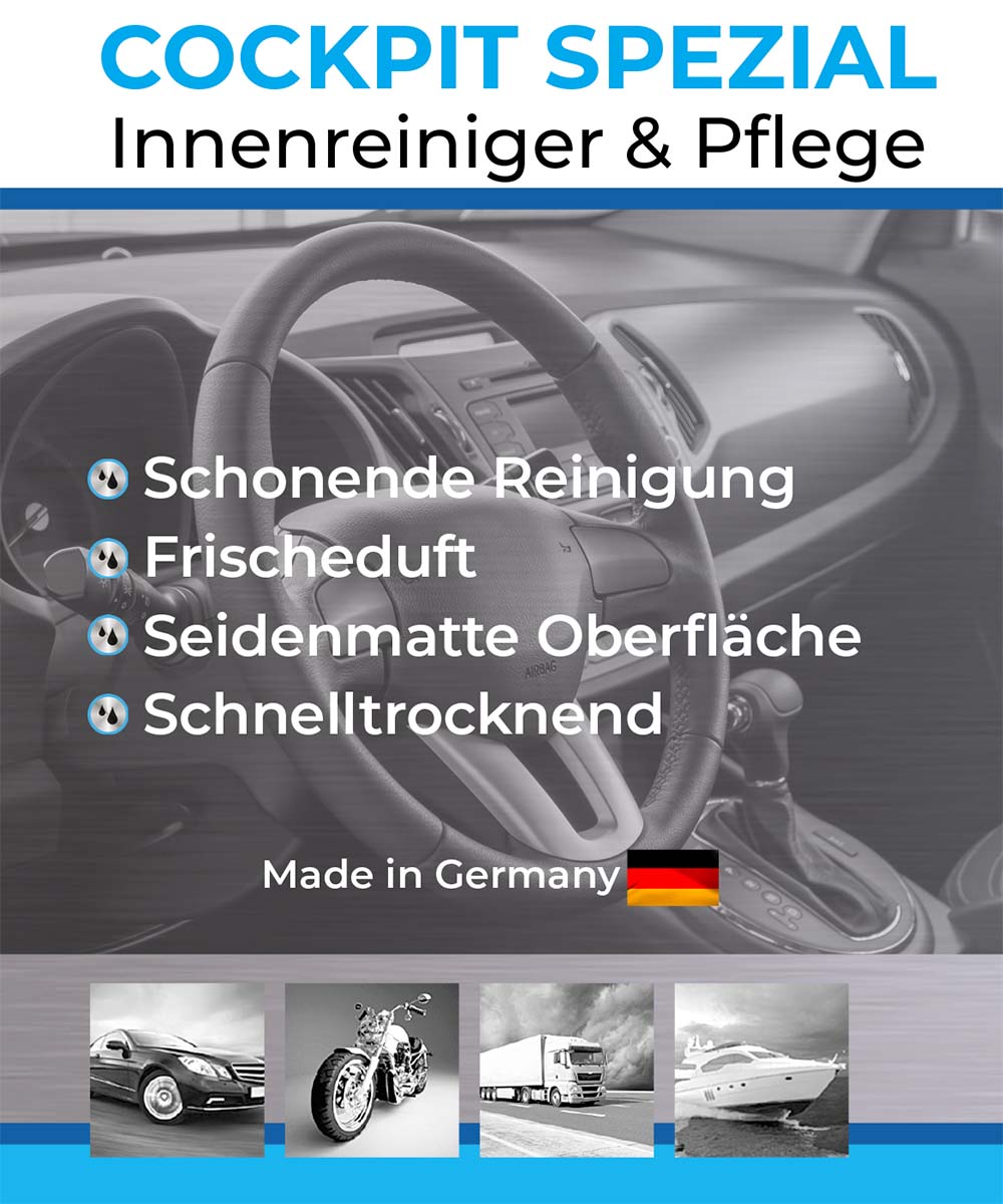 Unikum COCKPIT SPEZIAL reinigt und pflegt alle Kunststoffe, Gummiteile, Velour, Leder und sonstige Materalien in Innenraum und Außenbereich aller Fahrzeuge.Eigenschaften:COCKPIT SPEZIAL ist ein leistungsfähiger Spezialreiniger auf der Basis biologisch leicht abbaubaren Tensiden, wasserlöslichen Lösungsmitteln sowie hochwertigen Pflegekomponenten, die einen seidenmatten, antistatischen, blendfreien Film auf der gereinigten Oberfläche hinterlassen. Neueste hochwertige Tenside mit einem biologischen Abbaugrad von über 95% bilden die Grundlage für eine materialschonende Reinigung. Anwendung:COCKPIT SPEZIAL auf die zu reinigende Fläche gleichmäßig aufsprühen oder auftragen. Nach kurzer Einwirkzeit mit einem Schwamm / fusselfreien Mikrofasertuch oder weichen Bürste einarbeiten. Gelösten Schmutz mit einem Mikrofasertuch aufnehmen und abwischen. Nach dem Trocknen entsteht ein antistatischer, blendfreier Pflegefilm. Reinigt und pflegt alle Kunststoffe, Gummiteile, Velour und Leder. Lieferumfang: Unikum Cockpit Spezial Innenreiniger & Pflege 1L Flasche + Sprühkopf