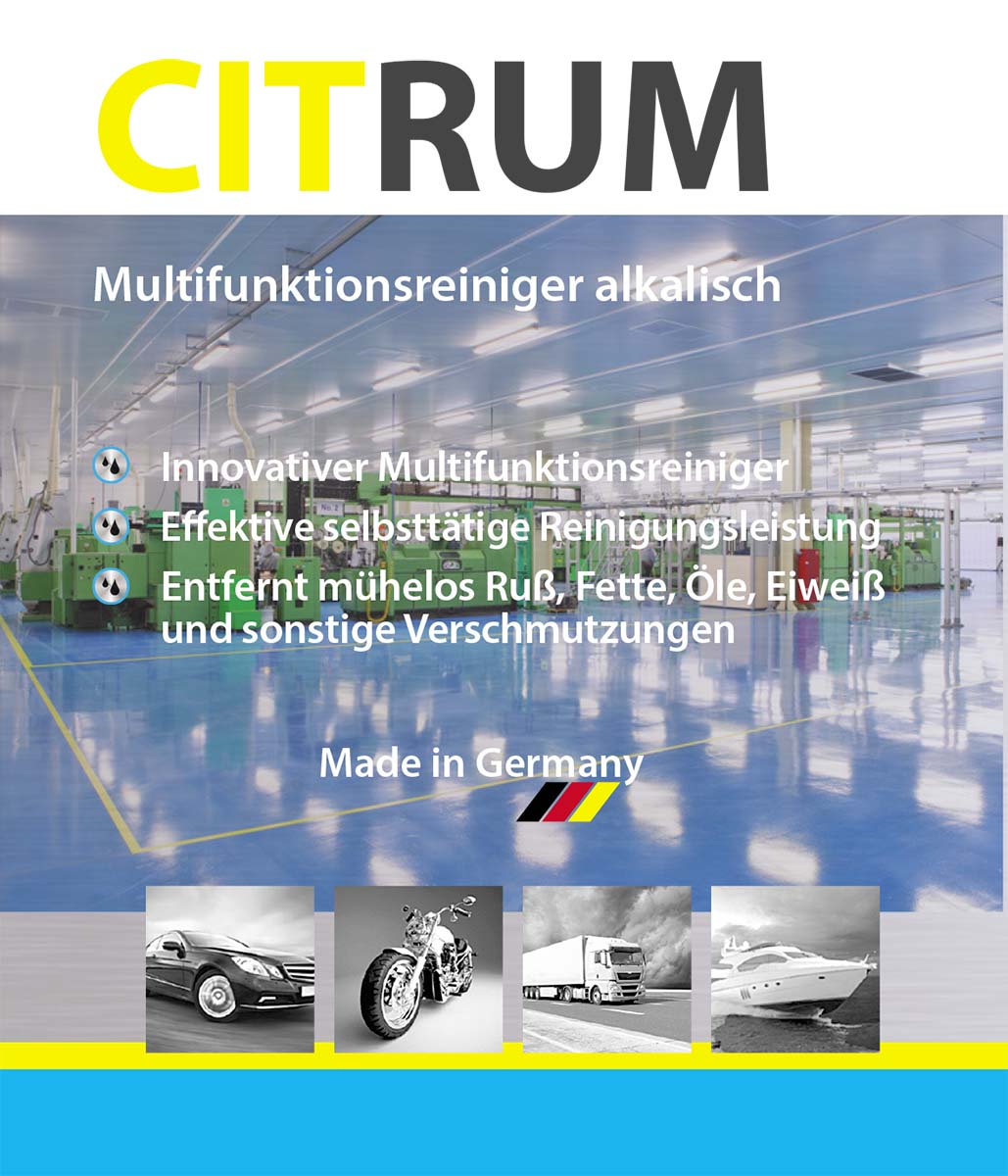 Unikum CITRUM ist ein leistungsstarker Multifunktionsreiniger mit sehr hoher Schmutzlösekraft. Das Allround-Talent für alle Industriebetriebe, insbesondere Automobil- und Flugzeugindustrie. Auch bestens geeignet für Fahrzeugaufbereitung, Eisenbahn, Transportwesen, Krankenhäuser, Brandsanierung, Gastronomie, Großküchen, Bäckereien, sowie Gebäudereinigung.Eigenschaften:CITRUM ist ein innovativer, alkalischer Flüssigintensivreiniger. Super hochkonzentriert, dadurch extrem ergiebig und sparsam im Verbrauch. Äußerst wirtschaftlich in der Anwendung. Sehr hohe Reinigungskraft durch die enthaltenen, modernen Komplexbildner. Entfernt mühelos Ruß, Fette, Öle, Eiweißrückstände und sonstige Verschmutzungen. Sehr hoher Anteil an organischen Komplexbildnern, dadurch besonders geeignet für hohe Wasserhärtegrade. Umwelt- und abscheidefreundlich.Anwendung:Das Konzentrat ist je nach Verschmutzungsgrad von 1:2 bis 1:100 verdünnen. Aufsprühen oder mit Schwamm auftragen oder im Tauch- und Ultraschallbadverfahren anwendbar. Nicht auf heißen Flächenanwenden. Produkt nicht antrocknen lassen Das Produkt erfüllt alle Anforderungen gemäß der Abwasserverordnung Anhang 49. Vorversuche auf empfindlichen Oberflächen zwingend erforderlich! Nicht mit anderen Produkten mischen! Vor Frost schützen Lieferumfang: Unikum Citrum 11kg Kanister